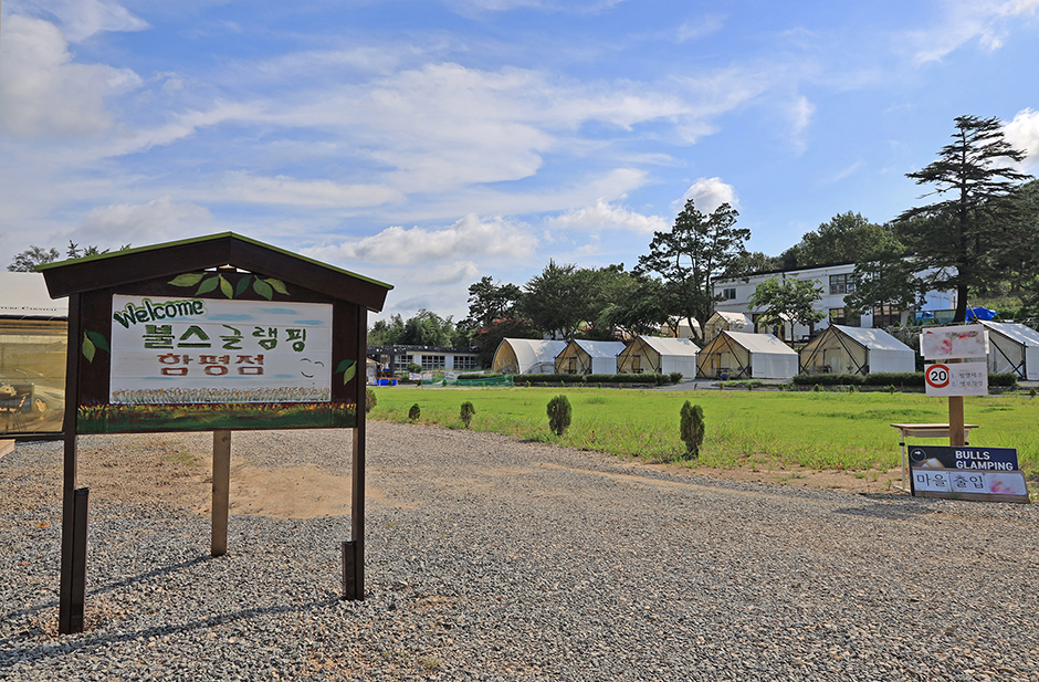 함평 불스글램핑은 나비 축제로 유명한 함평 나들목 가까이에 있다. 함평에서 주포항 가는 길이다. 작은 마을 안쪽 폐교를 글램핑시설로 리모델링했다. 교실은 관리사무소와 카페, 체험장으로 잔디가 깔린 운동장 양쪽으로 글램핑 텐트가 쳐져 있다. 글램핑 객실은 모두 세 종류인데 디럭스, 스위트, 로열로 내부시설과 비품은 거의 동일하지만 객실 크기가 다르다. 객실 내부에 와이파이, 에어컨, 화장실/샤워부스, 냉장고, 전기밥솥, 전자레인지, 취사도구 일체, 세면도구와 수건을 비치하고 있다. 에어바운스와 개별 바비큐 등을 즐길 수도 있다. 캠핑장에서 차로 10여분 거리에 돌머리해수욕장과 주포항, 주포한옥마을이 있다.