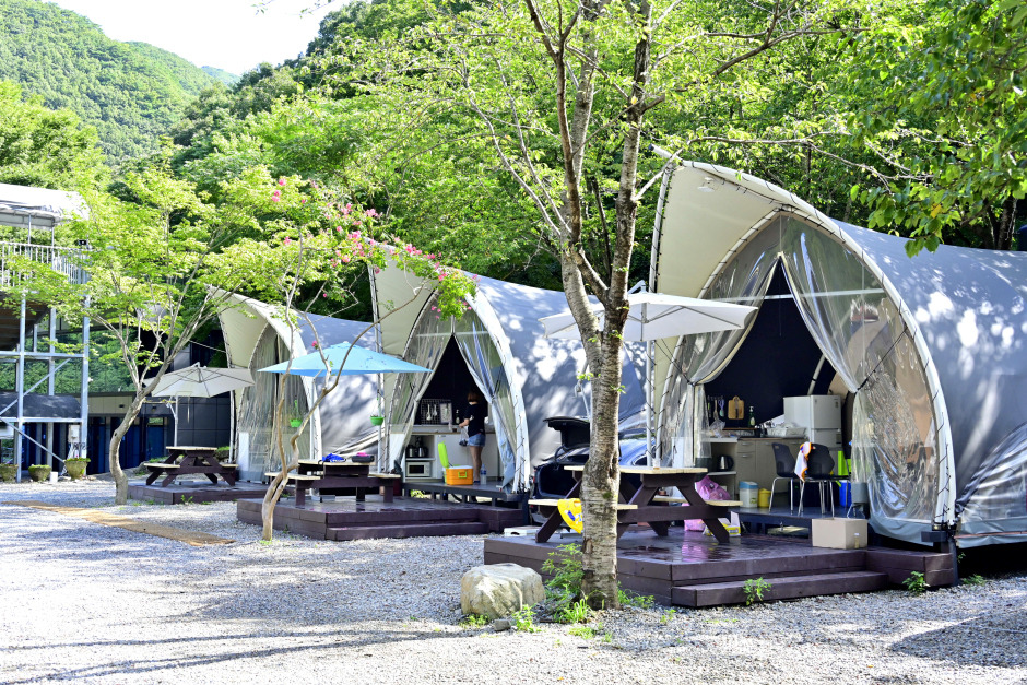 시설이 깔끔하고, 내부에 화장실과 에어컨, 전기장판이 있으며 온돌방으로 마련되어 있어 날이 더울 때나 추운 날에도 이용할 수 있다. 내부에 전기 콘센트를 포함해 화장대, 드라이기, TV, 스탠드가 있다. 간단한 싱크대에는 밥솥과 전자레인지, 인덕션도 마련되어 있다. 글램핑 룸 바로 옆에 주차 자리가 마련되어 있고, 데크에는 테이블 의자도 있어 편리함과 여행 감성 모두 챙겼다. 캠프포레에는 유독 아이들이 많은데, 여기에서 즐길 수 있는 놀거리가 다양하기 때문이다. 가까이에 계곡이 있고, 에버슬라이드, 흔히 말하는 워터슬라이드와 레일 썰매, 트램펄린이 마련되어 있다. 또한 가족, 연인, 친구와 즐길 수 있는 히노끼탕도 있어 이곳만의 특별함이 배가 된다.