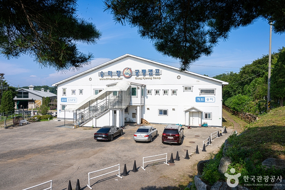 궁평캠프장 승마장은 다른 곳과는 다르게 승마장 외에 문화와 휴식을 위한 2D 카페가 본관 2층에 자리 잡고 있어 서부시대의 헛간과 대장간, 호텔과 가게들의 그림을 배경으로 멋진 사진을 촬영할 수 있고, 1층에는 키즈룸이 마련되어 있는 아이들이 이용할 수 있다.