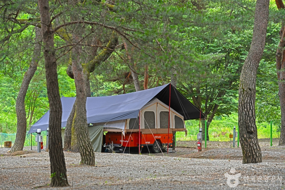 도명산 캠핑장은 충북 괴산군 청천면에 자리 잡고 있다. 캠핑장은 고즈넉한 농촌에 터를 잡고 있다. 산으로 둘러싸여 있어 자연친화적이며, 계곡이 코앞이라 여름철 피서지로 안성맞춤이다. 캠핑장에는 파쇄석으로 이루어진 오토캠핑 사이트 40면이 마련되어 있다. 사이트 면적이 넓기 때문에 대형 텐트를 설치하기에도 무리가 없다. 특히 캠퍼 3~4팀 만을 위한 독립 사이트도 운영 중이다. 다른 캠퍼들의 방해를 받지 않고 팀원들끼리 자유롭게 캠핑을 즐길 수 있어 인기다. 캠핑장은 카라반과 트레일러 출입이 가능하다. 중소형견에 한해 반려동물 동반 입장도 가능하며, 이 경우 목줄 착용과 배변 봉투 지참은 필수다. 캠핑장에는 여름철 개장하는 수영장, 각종 문화 행사가 열리는 문화광장, 복층형 방갈로와 펜션 등의 숙박시설, 먹을거리와 장작 등을 구입할 수 있는 매점 등 캠핑에 즐거움을 더해줄 시설이 갖추어져 있다. 캠핑장 인근에는 속리산 국립공원과 법주사가 위치하고 있어 연계 여행에 나서기 좋다.