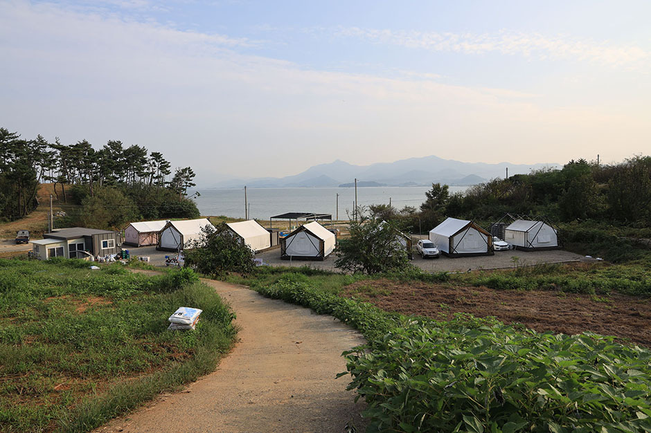 남해 더왕 글램핑장은 남해 설천면에 위치한 글램핑장이다. 총 7개의 글램핑장이 있는데, 개별 욕실 겸 화장실이 갖춰져 있고, 바닥 난방이 설치되어 있다. 캠핑장에서 낚싯대 대여도 하고 낚싯배도 섭외도 해준다. 아이를 동반 경우 여름에는 캠핑장 내 물놀이장에서 물놀이를 하기도 좋다. 바다가 멀찍이 보이는 뷰이지만, 사방이 탁 트여 있어서 시원스럽고 한적한 기분을 내기 좋다. 평일은 조식이나 바비큐를 별도로 예약하면 제공하고, 주말이나 성수기에는 기본 가격에 포함해서 제공하는데, 바비큐가 무제한으로 제공되고 있어서 호평받고 있다.