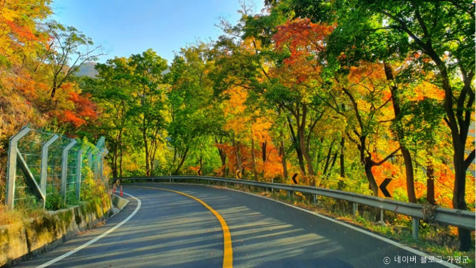 청평호와 호명산이 만든 드라이브코스이다. 사계절 좋으나 단풍이 있는 10월 말과 11월 초가 절정이다. 코스는 두 가지로 가장 잘 알려진 코스는 청평댐 입구 교차로에서 시작하여 75번 국도인 북한강을 끼고 가다가 가평대교, 신천교차로를 지나 37번 국도로 접어들어 청평대교까지의 약 30km의 길이다. 산과 호수가 단풍과 잘 어울린다. 북한강 주변에는 카페가 여럿 있고 중간에 주차할 곳이 있어 잠시 쉬어갈 수도 있다. 두 번째 길은 상지길이라 불리는 길로 가평읍과 청평면 사이에 위치한 호명산을 횡단하는 가평군 상지로 78~가평읍 복장리 319-1 간의 약 12km의 길이다. 구불구불한 길로 가끔 1~2대 주차공간이 있다. 봄에는 아카시아 꽃, 가을에는 단풍을 볼 수 있다.