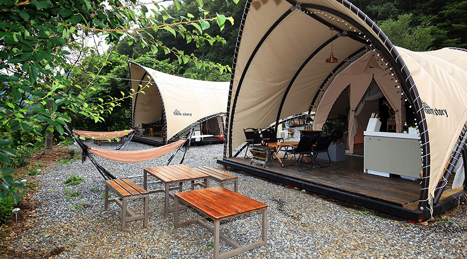 팜스토리는 경북 청도군 운문면에 자리했다. 청도군청에서 42㎞가량 떨어진 곳에 있어 자동차로 1시간 정도 소요된다. 이곳은 산으로 둘러싸여 있어 고개를 돌리는 곳마다 자연 친화적인 풍경이 시각적인 즐거움을 선사한다. 오토캠핑과 글램핑 모두 가능하다. 먼저 글램핑은 세 가지 형태로 나뉜다. 먼저 A형과 B형의 차이점은 크기와 내부 화장실 유무다. A형이 B형보다 더 크고 내부에 화장실이 있다. 이 밖의 내부 물품은 침대, 침구류, 소파, TV, 냉장고, 에어컨, 식기류, 취사도구 등으로 비슷하다. C형은 감성 글램핑에 초점을 맞췄으며 내부에 침구류가 없어 지참해야 한다. 세 가지 형태 모두 반려견 동반이 가능하다는 점도 매력적이다. 오토캠핑장은 10면이며 바닥 형태는 파쇄석이다.