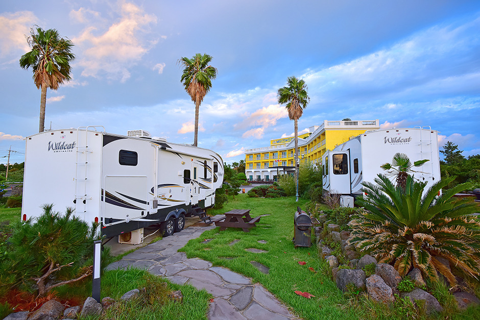 카라반 내부는 더블침대, 2층 침대를 포함, TV, 에어컨, 냉장고, 테이블, 소파와 주방용품을 갖췄고 화장실과 샤워실이 구비되어 있으며 와이파이 사용도 가능하다. 서우봉 해변과 올레길을 산책하기 좋고 4월이면 유채꽃이 만발하면서 장관을 이룬다. 호텔 내에 있는 수영장과 노래방, 골프연습실, DVD방 등의 부대시설도 이용할 수 있다