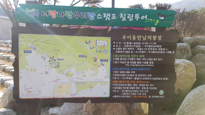 북한산은 우리나라 대표적인 등산로이자 아름다운산으로 이름 높은 산이다. 하지만 북한산 주변에 우리나라 근현대사 역사문화 유산이 있다는 사실을 알고 있는 분은 많지 않다. 강북구 스탬프 힐링투어는 우이-신설 도시철도 개통으로 방문하는 방문객들에게 우리나라 근현대사 역사문화인 손병희선생 묘역, 3.1운동의 발원지인 봉황각, 국립4.19민주묘지, 근현대사기념관, 이준열사 등 역사문화 유산들을 하나로 묶어 건강, 운동, 교육을 함께 할 수 있는 역사문화관광 체험프로그램이다. 또한 4개 스탬프를 모두 완주할 경우 주변 음식점에서 음식값 10%할인 혜택과 홈페이지에 후기 게시물을 올릴 경우 추첨을 통해 소정의 기념품을 준다. 특히 문화관광해설사가 상시 배치되어 방문하는분들께 문화유산을 친철히 설명해주는 것이 대표적이다.