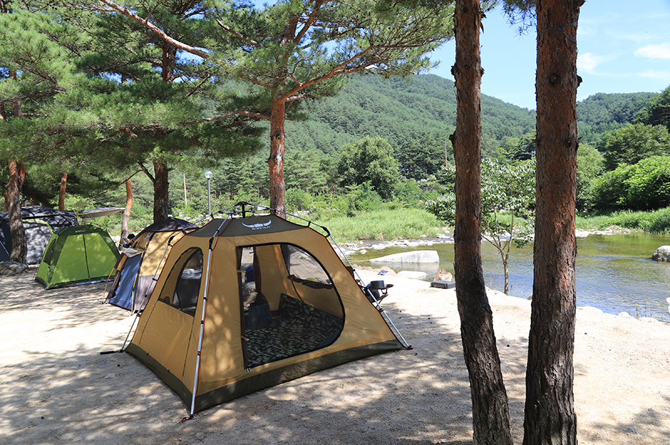 오대산국립공원내 위치한 소금강자동차 야영장. 맑은 소금강계곡에서 물놀이는 어른도 아이도 들뜨게 만든다. 국립공원내 캠핑장이라 관리가 잘되어 있다. 사이트 주변 나무들도 크게 자라 그늘이 좋다.