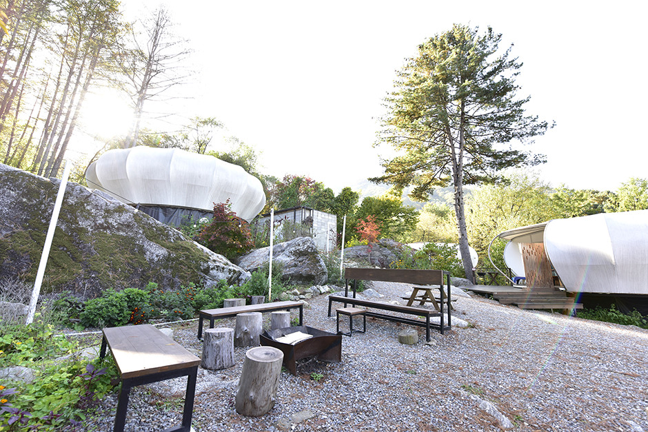 아침 고요수목원에서 가까운 소규모 캠핑장으로 7개의 사이트만 있는 조용하고 가족 같은 분위기의 캠핑장이다. 바닥은 파쇄석으로 되어 있고, ㄱ자 구조로 배치되어 있어 시야가 답답하지 않다. 관리동 건너에 수영장이 있어, 아이들과 물놀이하기 좋다. 매점은 없지만, 가까이에 편의점이 있고, 2차선 도로와 가까워서 차소리가 조금 거슬릴 수 있지만, 통행량이 많진 않아 캠핑 기분을 내는데 큰 무리는 없다.