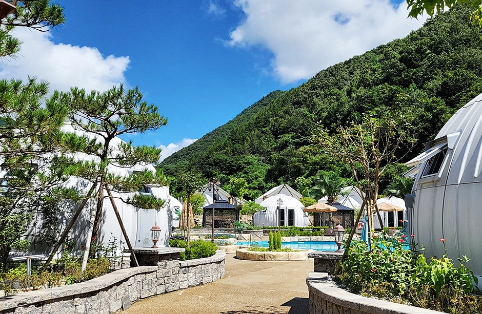 철원의 담터계곡 상류에 위치한 이색 돔 글램핑장이다. 관리동과 수영장은 리조트처럼 잘 꾸며져 있고, 돔 형태의 글램핑 사이트가 총 9개가 수영장 둘레를 따라 둥글게 배치되어 있다. 사이트마다 야외 개별 바비큐 공간과 테이블이 있고, 숯과 석쇠도 1회 무료 제공된다. 수영장은 일반 수영장과 온수 수영장이 있는데, 낮에도 물놀이하기 좋고, 예쁘지만, 특히 밤에 조명이 무척 아름다워 이국적인 기분을 내기 좋다.