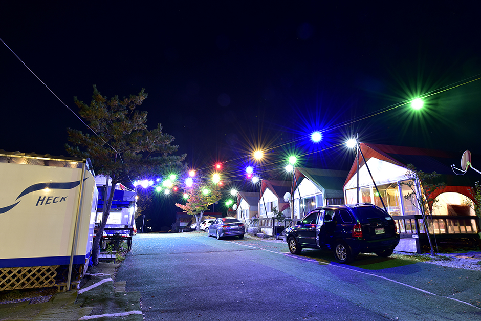 사계절 내내 이용 가능한 온수 수영장과 독채로 운영되는 객실까지 호텔 같은 편안함을 추구하는 글램핑장이다. 텐트 앞을 관통하는 수영장, 텐트마다 설치된 100인치 스크린, 에어컨, 복층구조의 글램핑 객실은 캠핑이라기보다는 호텔에 가깝다. 저녁이면 다양한 조명으로 글램핑장의 또 다른 분위기를 느낄 수 있다. 숙소와 바비큐장이 분리되어 있어, 식사 후에도 숙소는 고기 냄새 없이 쾌적하다. 글램핑장에서 차로 5분 거리에 대형마트가 있어 식재료 등 쇼핑도 쉽다.
