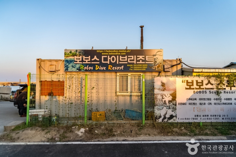 보보스다이브 리조트는 바로 앞에 바다와 배가 있어서 체험할 때 장비를 챙겨 배까지 오래 걸어갈 필요가 없다. 테이블 위에는 예약한 강사님 이름으로 자리가 정해지는데 그 자리에 장비를 펼쳐 놓고 오리발을 챙겨서 배로 걸어가면 된다. 다이빙 사무실이자 장비 보관실이 있고 야외에는 장비 씻는 바구니가 여러 개 있어 다이빙하고 난 후 기다리지 않고 바로바로 세척 가능하다. 버스 내부를 개조한 타요버스카라반에는 에어컨도 있고 냉장고에 생수도 넉넉하게 있다. 다이빙 포인트는 스텔라 난파선, 엠버33호 난파선, 장갑차, 해중공원 등이 있고 수심은 30m 깊이를 왔다 갔다 하는데 하강할 때 10m 초반까지 조류가 꽤 세다. 난파선 주위에는 샛노란 물고기도 있고 문어 등이 발견되어 즐거운 다이브를 즐길 수 있다. 체험을 하기 전 이용 시간과 요금에 대해서 전화 문의는 필수이다.