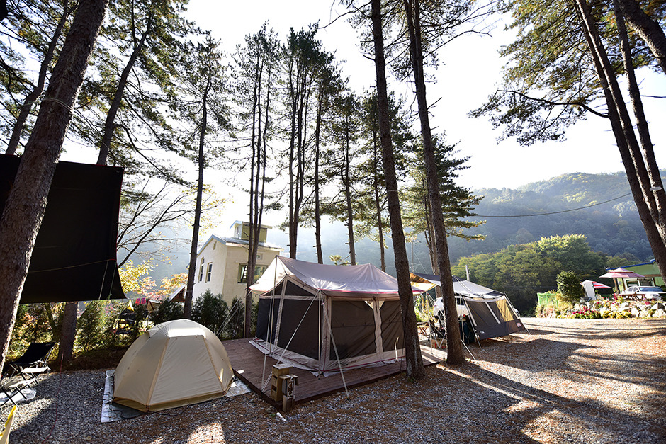 아침 고요수목원에서 가까운 소규모 캠핑장으로 7개의 사이트만 있는 조용하고 가족 같은 분위기의 캠핑장이다. 바닥은 파쇄석으로 되어 있고, ㄱ자 구조로 배치되어 있어 시야가 답답하지 않다. 관리동 건너에 수영장이 있어, 아이들과 물놀이하기 좋다. 매점은 없지만, 가까이에 편의점이 있고, 2차선 도로와 가까워서 차소리가 조금 거슬릴 수 있지만, 통행량이 많진 않아 캠핑 기분을 내는데 큰 무리는 없다.