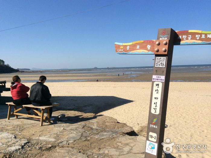 변산마실길은 새만금방조제 1코스부터 줄포생태공원 8코스까지 총 66km의 해안 길을 따라 조성된 길이다. 변산 마실길 1코스 조개미 패총길은 새만금 홍보관을 시작으로 대항리 패총, 변산해수욕장, 송포포구로 이어지는 길이다. 조개미 패총길은 밀물과 썰물에 따라 해안 야산 길과 바닷길을 선택하여 걷는 코스로 갯벌 체험을 즐기면서 남녀노소 누구나 걸을 수 있는 길이다. 대항리패총은 옛사람들이 조개를 먹은 뒤 버린 조개껍데기와 생활 쓰레기가 함께 쌓여 이루어진 유적으로 조개더미라고도 한다. 변산해수욕장은 서해안의 대표적인 해수욕장으로 하얀 모래와 푸른 솔숲이 어우러져 [백사청송] 해수욕장으로도 불린다. 송포포구는 변산반도 북서쪽에 위치한 변산해수욕장의 남단에 움푹 들어가 있는 곳에 있는 어항이다.