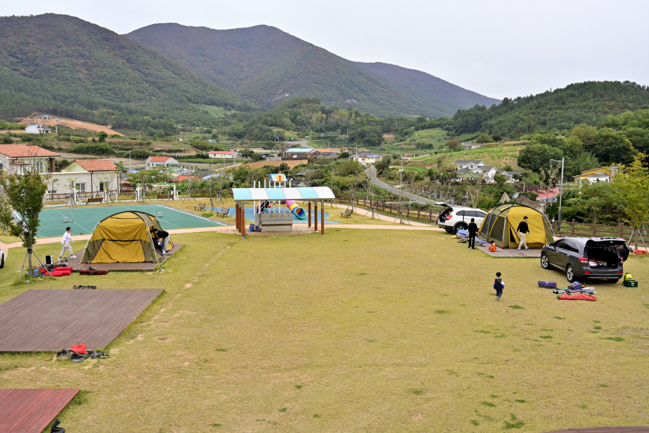 해울림센터 캠핑장은 소록도를 지나 거금도에 위치한 숨은 캠핑 명소이다. 7월 중순에서 8월 중순까지 개장하는 연소해수욕장과도 가깝고 캠핑장이 지형적으로 만(灣)처럼 돌출되어 있는 곳에 위치해 있어 삼면이 바다로 둘러싸인 곳이다. 그만큼 여름에는 바람이 많이 불어 시원하다. 전체 사이트 수는 6곳으로 적은 편이라 쾌적하고 조용한 캠핑이 가능하다. 아름다운 석양과 일출을 바라보기에 적합한 위치라 시시각각 변하는 몽환적인 하늘을 감상하기 좋다. 주차장, 화장실, 샤워장, 식수대, 잔디밭, 산책로, 놀이터, 배드민턴장, 축구장이 전체적으로 오밀조밀 깔끔하게 관리되고 있다. 체크인 손님에게 주는 웰컴 막걸리는 거금도의 유일한 양조장 금산주조장에서 만든 ‘거금도 유자 동동주’이다. 지역 특산물까지 챙겨주는 고흥 해울림센터 캠핑장에는 아이들을 위한 트램펄린도 설치되어 있다.