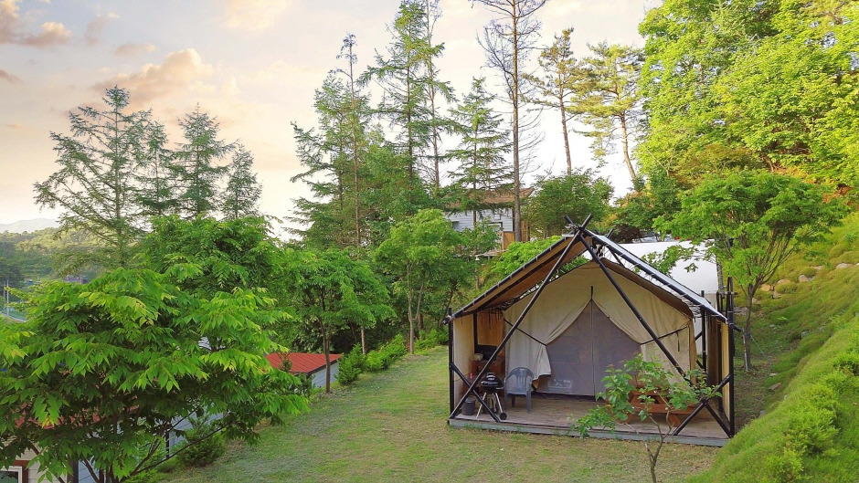 시원한 자연을 관망하고 넓은 자연경관이 그대로 살아있는 글램핑이다. 하루 종일 물소리, 새소리, 풀벌레 소리가 속삭이듯 자연을 품은 글램핑장은 밤이면 머리 위로 별들이 쏟아질 듯 보이며 밤의 숲에서는 이름 모를 풀벌레의 노래와 반딧불이 빛나는 곳이다. 부대시설로 대형수영장과 워터슬라이드가 있어 여름철 물놀이가 가능하며 조식 제공과 바비큐 무한리필 서비스가 있다.