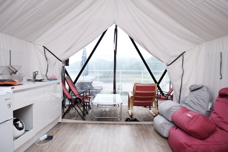 충주호의 풍경이 한눈에 들어오는 럭셔리 글램핑장이다. 캠핑장 진입하는 도로는 봄에는 벚꽃놀이와 가을 단풍구경하기에도 좋다. 충주호를 뒤로 내려다보며 캠핑장 내 수영장에서 물놀이를 즐길 수 있으며, 라운지와 조식 서비스를 이용할 수 있다. 객실 외부에는 바베큐장이 있어 충주호를 바라보며 바비큐를 즐기기 좋다.