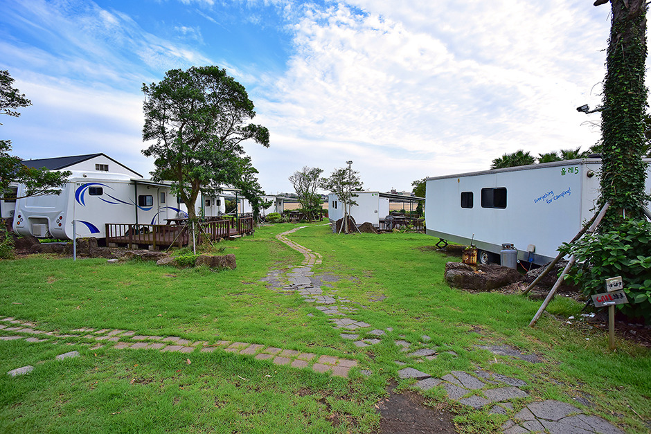 제주캠핑카라반은 아름다운 표선해수욕장과 도보로 5분 거리에 위치해 있는 바람, 올레. 오름, 한라산의 이름을 가지고 있는 조경이 예쁜 카라반 캠핑장이다. 아침에 일어나 눈을 뜨면 탁 트인 풍경과 철썩이는 파도가 보이는 넓은 호수 같은 바닷가가 보이는 곳이다. 제주 올레길 3코스의 끝과 4코스의 시작점인 표선해수욕장과 마주보고 있어, 올레길 여행 베이스캠프로도 좋다. 캠핑장 인근 바다 산책로를 걸으며 힐링을 누릴 수 있다. 카라반은 유난히 넓고 깨끗한 내부시설을 자랑한다. 편리하게 사용할 수 있는 침대, 가구, 취사도구 등 이 가지런히 갖춰져 있어, 인근에서 신선한 재료들을 사다가 원하는 요리를 해 먹을 수 있다는 것 또한 호텔과는 다른 또 다른 매력이 있는 카라반 캠핑이다. 카라반 옆으로 테라스가 있어 해지는 노을을 바라보며, 맛있는 바비큐를 해먹을 수 있다.