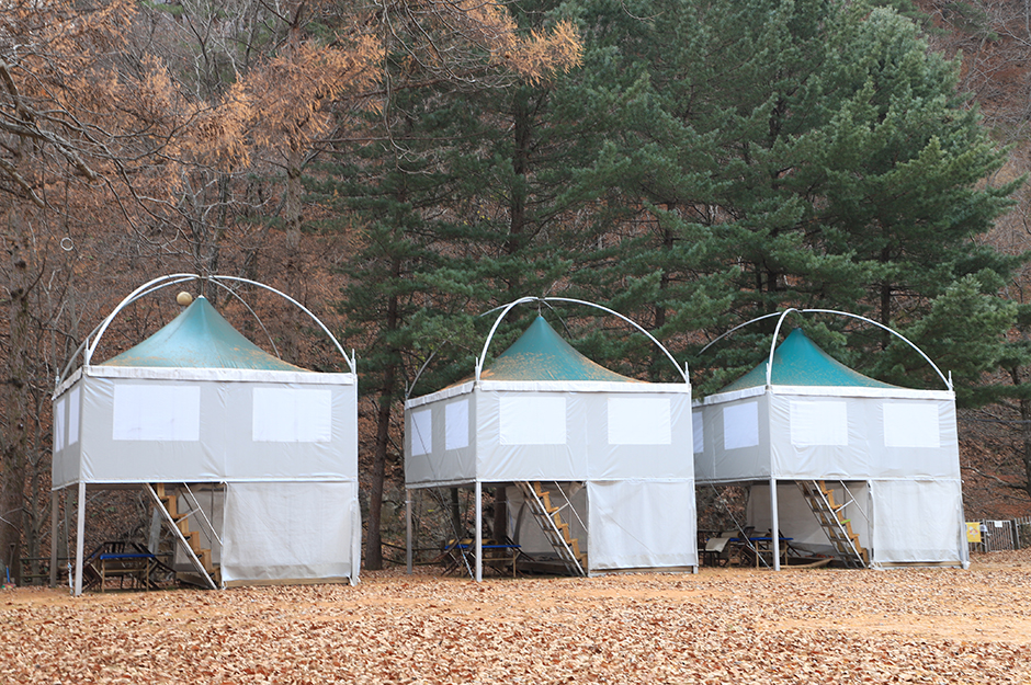 웅진 계곡 숲 야영장은 예전에는 양구 학생야영장으로 알려진 양구의 폐교 캠핑장이다. 운동장과 계곡에 데 큰 석이 20여 개 있고, 방갈로도 함께 운영 중이다. 홈페이지나 온라인 예약을 진행하지 않아 전화로 예약을 해야 하는데, 사이트 간 간격이 널찍해서 한적하고 조용한 캠핑을 즐길 수 있다. 여름에는 계곡 물놀이를, 가을이면 노랗게 길을 채우는 단풍나무들 사이로 산책을 즐길 수 있다. 캠핑장에서 사명산 등산로로 연결이 되어 있어 등산을 할 수 있다. 아이들이 놀 거리는 그리 많지 않아, 단독 캠이나 친구끼리나 연인끼리 방문해서 호젓함을 즐기는 것이 어울리는 야영장이다.