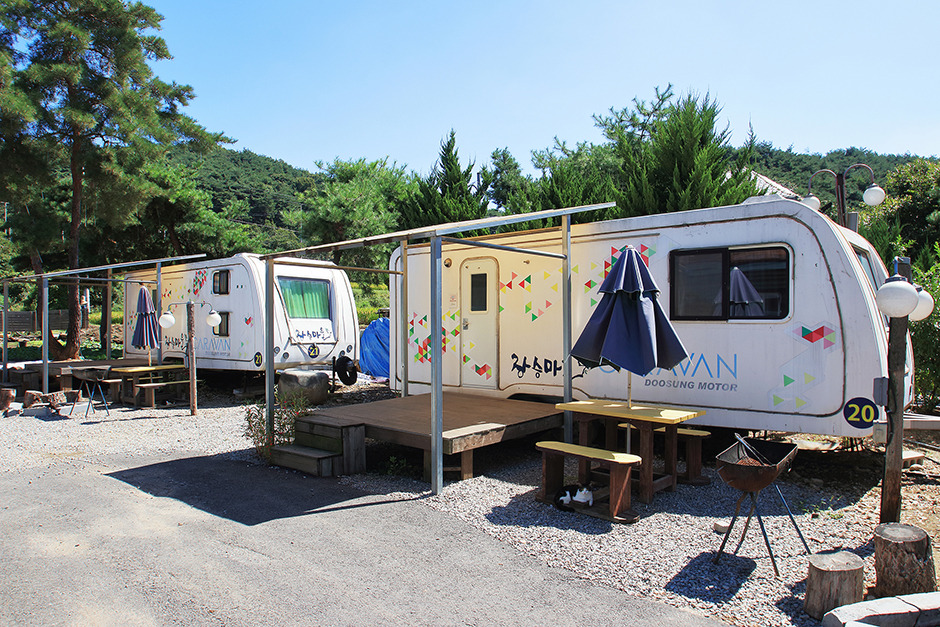 장승마을 테마파크는 충남 공주시 사곡면에 자리 잡은 캠핑장으로 다양한 장승 조형물과 밤이 되면 볼 수 있는 빛 축제로 유명하다. 카라반 33대로 이뤄져 있고 내부는 침대, 소파, 개수대, 취사도구, 식기, 화장실, 샤워실, 냉장고, 전자레인지, 전기밥솥 등 편의시설이 잘 갖추어져 있다. 카라반 외부에는 전용 데크를 설치했고, 일체형 의자와 테이블도 비치해 바비큐를 즐길 수 있다. 사계절 내내 평일 주말 구분 없이 운영하고 있다. 예약은 전화와 온라인, 현장 접수로 가능하다. 캠핑장 가까이 마곡사, 유구 시장 등이 있어 연계 관광도 순조롭다.