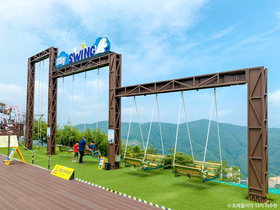 강원도 홍천에 자리한 해발 580m의 매봉산 정상에 도착하면 스카이 스윙의 위용을 마주할 수 있다. 스카이 스윙은 7m 높이의 초대형 그네로 인도네시아의 발리 스윙을 연상시킨다. 1인용과 2인용, 4인용 그네로 구성돼 있어 가족이나 친구, 연인은 물론 홀로 스카이 스윙의 스릴을 만끽할 수도 있다. 안전장치를 착용하고 이용수칙을 주지한 후 그네에 탑승하면 안전요원이 뒤에서 힘껏 밀어준다. 한 마리 새처럼 구름 위로 날아오르면 발아래 팔봉산과 주변 경관이 한눈에 펼쳐진다. 구불구불 이어진 서로 다른 높이의 산등성이들이 마치 물결치는 것처럼 느껴진다. 산자락에서 불어오는 시원한 바람이 온몸을 휘감으면 땅에서는 느낄 수 없는 상쾌함이 밀려온다. 스카이 스윙의 탑승 시간은 약 3분이며, 매봉산 정상까지는 비발디파크에서 운영하는 곤돌라를 타고 편리하게 이동할 수 있다.