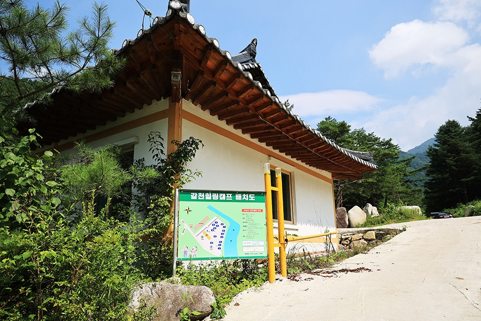 양양에서 홍천으로 넘어가는 구룡령 초입에 위치하고 있다. 고개 오르막길 시작 지점에서 갈천약수 이정표를 따라 갈천약수교를 건너고 바로 좌회전해 마을 안쪽으로 들어가면된다. 길 끝지점에 제법 큰 한옥이 한채 있고 그 뒤로 서 있는 울창한 소나무숲이 캠핑장이다. 작은 개울이 빙둘러 흐르고 위쪽에 있는 작은 사방댐에서는 마치 폭포처럼 물줄기가 흘러내려 풍광이 훌륭하다. 여름에는 이곳이 물놀이장으로 사용된다.