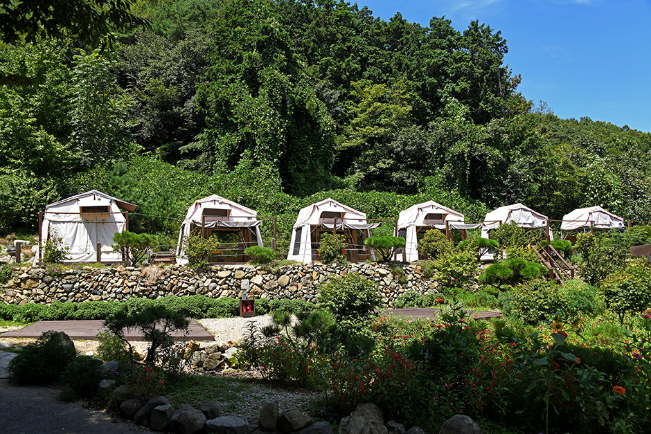 돌담캠핑장&글램핑장은 경남 창원 진동에 위치하고 있으며 글램핑과 야영장이 함께 있는 캠핑장이다. 일명 돌담농장으로 돼지, 공작, 닭, 꿩, 금계 등 20여 종, 70여 마리의 미니동물원이 있다. 또한 돌담캠핑장 앞으로는 논이 펼쳐져 있어 자연스레 어린이들의 시선을 잡기에 충분하다. 논에는 개구리, 올챙이 등 무언가가 쉴 새 없이 움직이고 있고, 논 밑 작은 계곡에는 작은 물고기와 민물새우가 살고 있어 자연스레 자연학습장이 된다. 실내에는 모래로 만든 모래놀이터와 그 위에 설치된 놀이시설들이 있다. 돌담캠핑장은 깨끗한 화장실과 개수대를 빼놓고는 말을 할 수가 없다. 샤워장은 1인 샤워장이라 더더욱 좋다. 이곳의 가장 인기 있는 사이트는 C3~C4다.