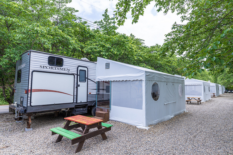 경북 포항 칠포해수욕장 근처 넓고 푸른 잔디밭 사이트가 특징인 칠포오토캠핑장이다. 원래 골프장이었다고 하니 그 특유의 탁 트인 초록색이 눈에 먼저 들어온다. 아이들을 위한 야외물놀이장과 자연생태학습장이 있다. 주변 곤륜산 암각화 트레킹과 해변 어촌마을에서 바다 낚시를 체험할 수 있다.
